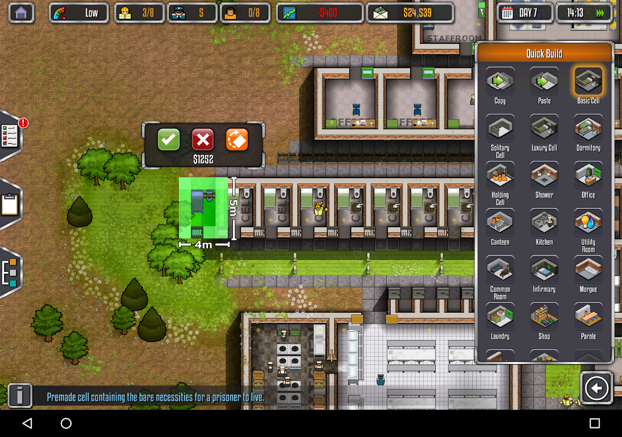 Prison Architect, developed by Introversion Software, challenges players to build and manage a maximum security prison, to place out cell blocks and stuck facilities, for the management of staff pay and moral prisoner. Prison projects will include basic needs such as cells, canteens, guard rooms, and infrastructure, but players may also include features like solitary confinement, training areas, and even an execution chamber. The tablet version comes with enough to get you started, with campaign chapters based on additional stories and more features available as premium content.